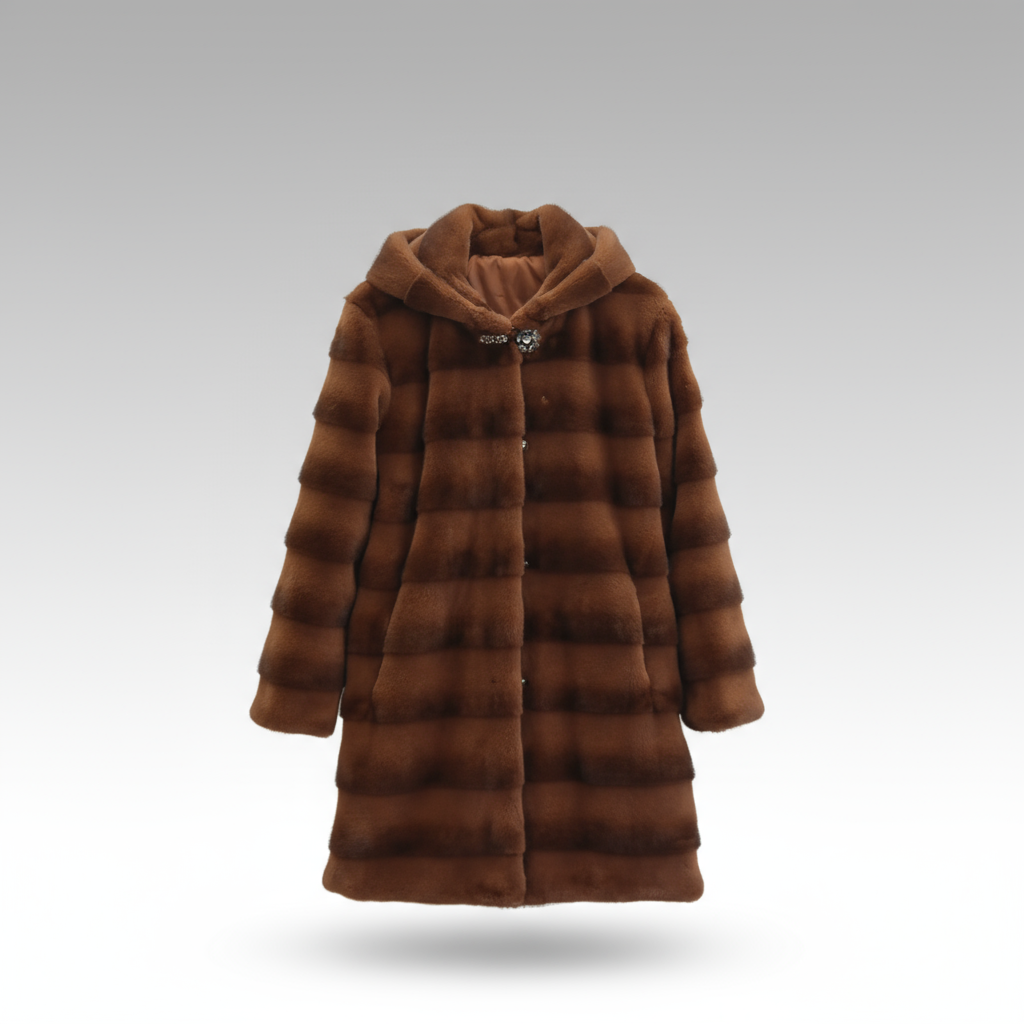 Design details: Longline length, hood with fur trim, decorative jeweled buttons, horizontal paneling effect, full sleeves